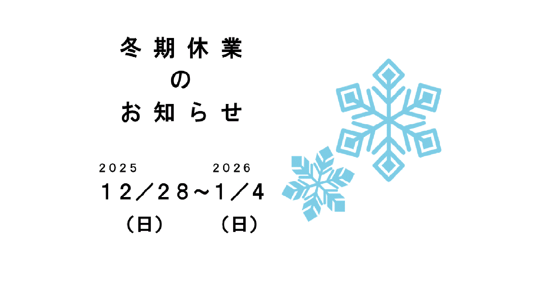2025年12月19日お知らせ 休業日のお知らせ 平素は格別のご高配を賜り、厚く御礼申し上げます。 誠に勝手ながら弊社は下記の期間、休業とさせていただきます。 ★12/28(日)~1/4(日)冬期休業 1/5(月)より通常の業務に戻ります。 休業期間中のお問い合わせ等につきましては1/5(月)以降の対応となります。 ご不便をおかけしますが何卒よろしくお願いいたします。